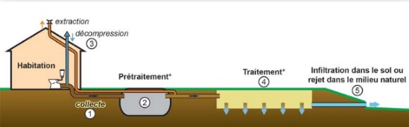 Par assainissement non collectif, on désigne tout système d’assainissement effectuant la collecte, le traitement, l’infiltration ou le rejet des eaux usées domestiques des immeubles non raccordés au réseau d’assainissement collectif. Il peut s’agir d’une maison seule, d’un groupement d’habitations, d’un camping, d’un gîte, de vestiaires, etc.